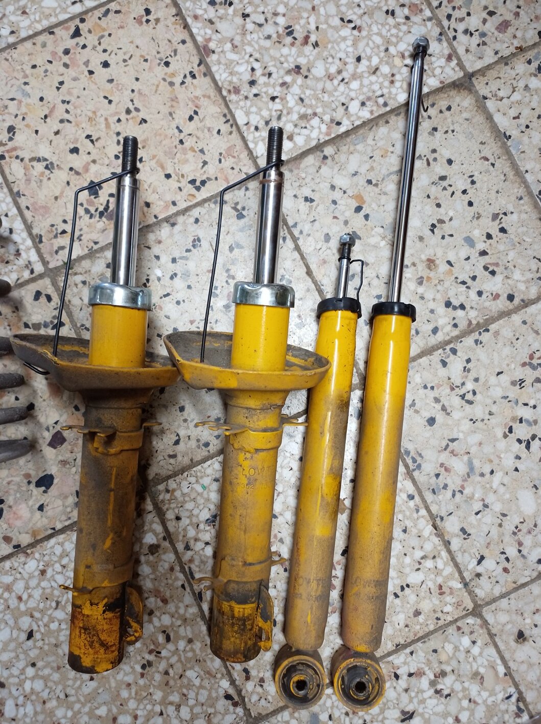 Možná,kdyby jsi se více a pozorněji díval a méně psal,jistě bys nepřehlédl,že oba přední a jeden zadní jsou zafixovány transportním přípravkem ve stlačené poloze.Ten zcela vpravo je naopak vysunutý, protože aretační drát, který drží tlumič v zasunuté poloze se vyvlékl a pístnice se vysunula.Ten drát je vidět na všech tlumičích, dokonce i na tom vysunutém.