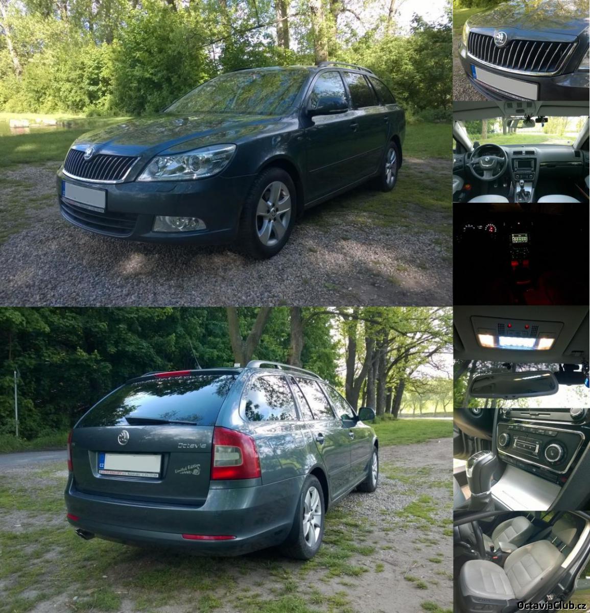 Škoda Octavia II Combi Elegance 1.8 TSI 118kw MR 2010 má předělaný interier na Laurin & Klement a ještě něco navíc... Interier Laurin & Klement: - kombinace světle šedá/černá - sedadla kožená vyhřívaná elektricky nastavitelná (bez paměti) - podsvícené kliky - prahové lišty s logem L&K Pár doplňků ze Superba: - kožená řadička s chromovým prstýnkem - spínač světel s chromem - podsvícená lampička s difuzním osvětlením - parkovací asistent pro podélné stání - podsvícené ovladače středových ofuků Zrcátka vyhřívaná, sklopná, obě samozatmavovací Maska černá-lesklá s chromem (original z Čínské Octavie) s lakovanou horní částí Alarm a dálkový start přes GSM Nové znaky přední/zadní/kola/motor Chip PowerTec 159 KW / 216 PS / 301 Nm Handsfree, Navigace Columbus, tmavé folie, ostřikovače světel...