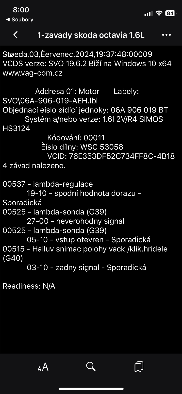 Zdravím, mam octavii 1 1.6 sr 74 kw 2000 benzin. Na diagnostice mi ukazal problem lambdy, a celkove velka spotreba na volnobeh byla spotreba ruzna nekdy 20/100, 14/100 atd. Prumerna spotreba je okolo 8-10/100 a kdyz stojim tak mi spotreba jen stoupa. Predevcirem jsem menil lambdu (pred katalyzatorem) a po vymeneni jsem zadne zmeny nenasel spotreba stale stejna, nijak se nezmenila. Po vymene jsem ale auto na diagnostiku nedal tim padem jsem nevymazal pamet zavad. Chci se zeptat ma to vliv na to kdyz jsem nevymazal pamet zavad nebo ne? Popr. cim dalsim to muze byt ze to ma tak velkou spotrebu? Zkousel jsem odpojit baterku pro reset řj. Ale nepomohlo. Dekuji za odpoved.
