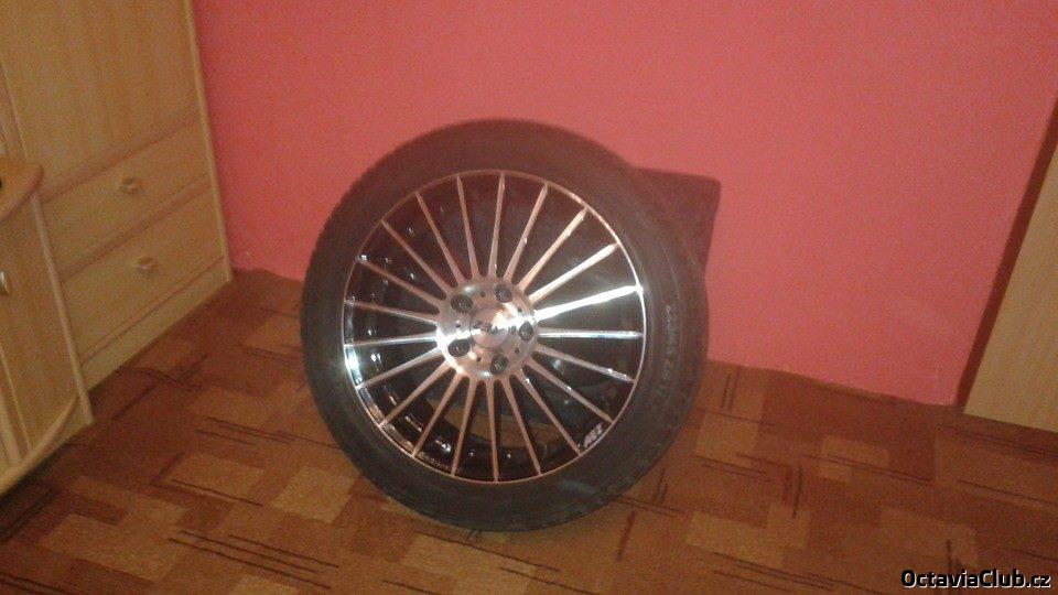 post-32743-0-83746100-1425051321_thumb.jpg - kola z Golfu GTI už jsou minulost. :) Na internetu se jsem našel jiné, AEZ Valencia Dark bez pneu za přijatelnou cenu. Kola se mi už dřív hodně líbily, tak jsem si je u prodejce zamluvil a na různé facebookové bazarové stránky jsem rozvěsil ty moje, že jsou na prodej. Ihned se mi ozval kluk z Ústí nad Orlicí, že o ně má zájem a že si pro ně hned přijede. Nechali jsme to až na druhý den, klučina přijel, nazul na svého Passata B5,5, vyzkoušel si je a řekl, že je bere. :palec: Jeli jsme tedy ke kamarádovi na servis, on kola vyzul, nový majitel naložil ráfky, já pneu a ještě včera večer jsem mazal do Pardubic pro ráfky nový. :) Prodejce mi rovnou nazul pneu, kola vyvážil a já šťastně vyjel k domovu. Přidávám foto z večera po návratu, kde toho však není moc vidět a jedno foto z netu, ať vidíte, co jsou zač. Do nové sezóny na nových kolech. :prcprc: