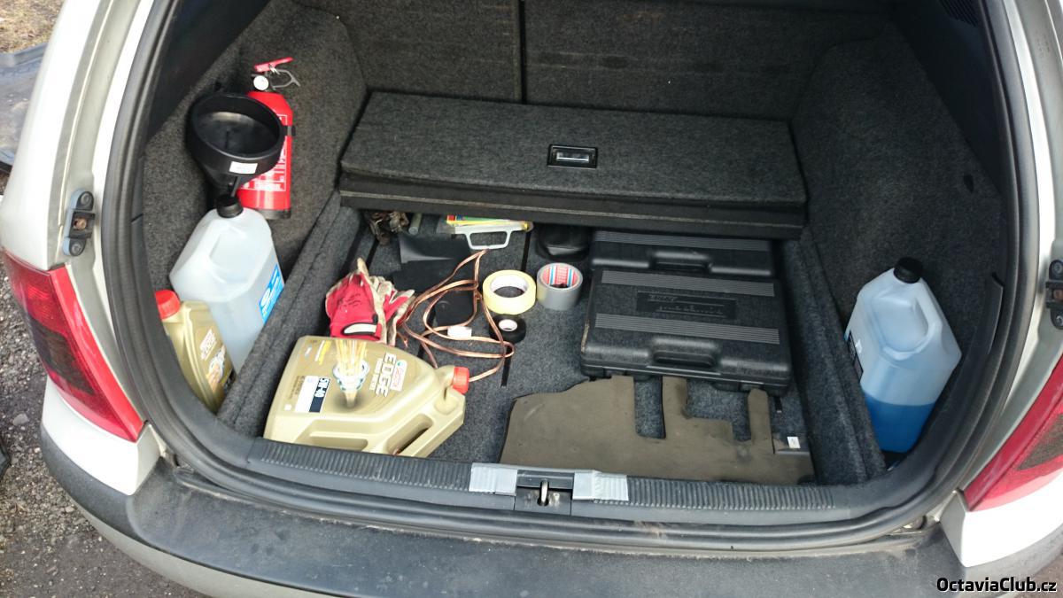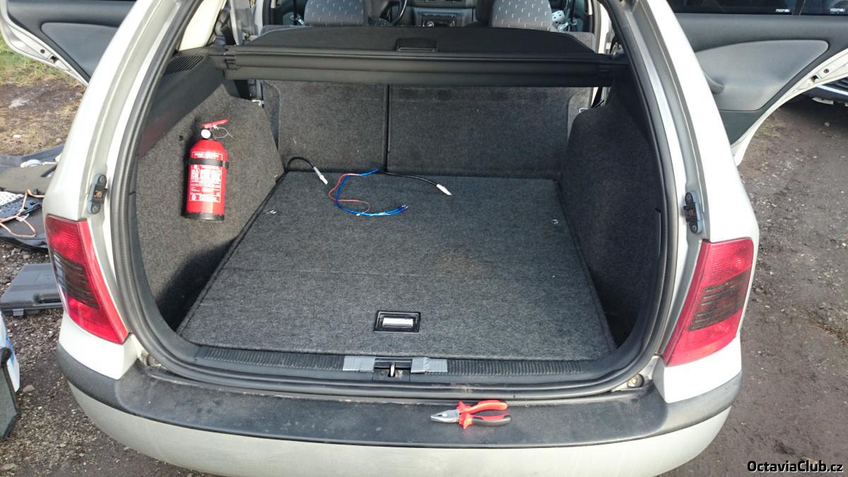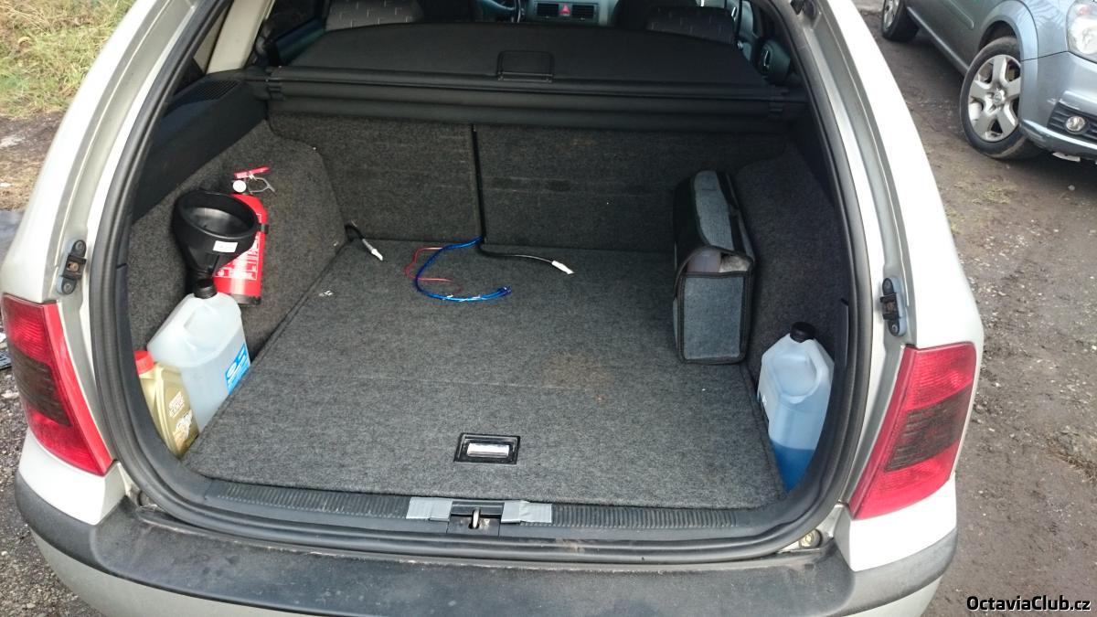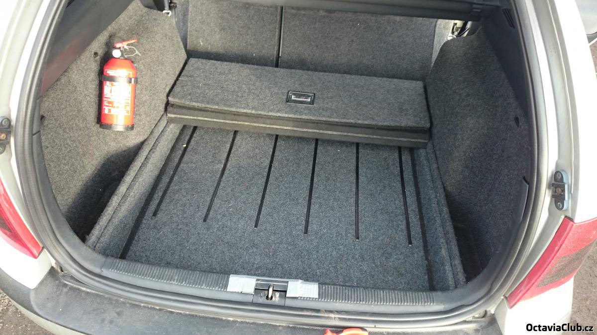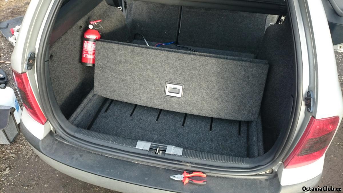 Jo vypadá to skvěle :) Už aby nahoře seděl basák :palec: Jen je tam krkolomnej přístup dolu k rezervě... Bylo by asi lepší sehnat celej ten spodek z auta, kde byla ta podlaha originálně.. Takhle je nutné vždy jednu stranu povolit a přizvednout. Víc to oříznout nejde protože je tam to prkno