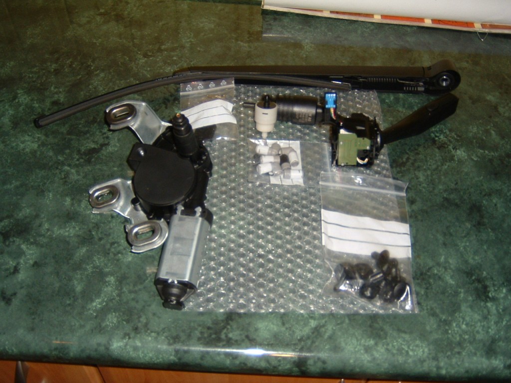 Potřeba je nové zadní slko s dírou pro stěrač,motorek,dekl na 5 dveře pro stěrač,stěrač,3 svazky,já použil jen dva(vyrobil jsem je),hadičku,motorek do nádobky,páčku a nějaký spojovací materiál na hadičky atd.