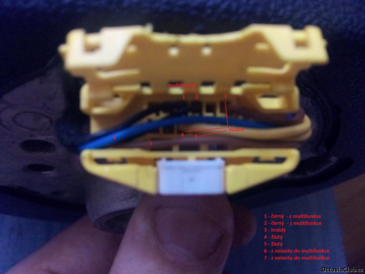 no.. podle toho co pises tak uz mam problem hned v barvach dratu.. :D ,v priloze posilam obrazky konektoru a dratu a airbagu,klaksonu.. z airbagu samotnyho mi jdou žlutý 2 ,pak klakson modrý a kostra 2 hnědý. z toho klakson jde do multifunkce a 1 kostra do konektoru a 2. do multifunkce. Tak jestli bys mi dokazal pomoct kterej kam prepinovat/prepojit ,tak bych ti byl vděčnej